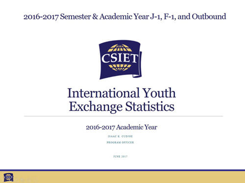 Please Note: These statistics are based on data reported to CSIET by exchange organizations voluntarily applying for listing in the CSIET Advisory List. Since not all U.S.- based exchange organizations apply for CSIET listing, the statistics in this report do not include every existing U.S. Youth Exchange Organization. Additionally, the accuracy of the data collected is contingent on what is presented by applicant youth programs and is not externally verified by CSIET.