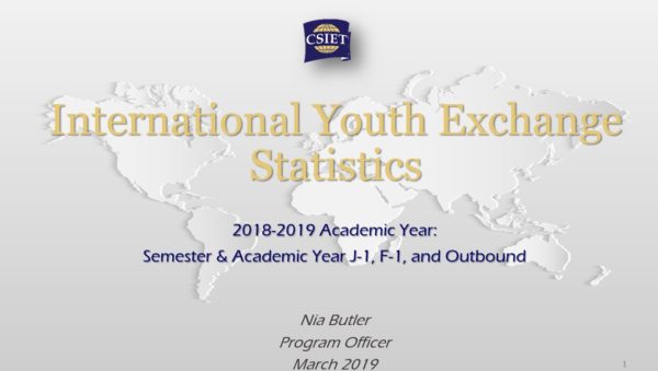 This report provides international youth exchange statistics from the 2018-2019 academic cycle. Specifically, it covers trends of high school students- both from the U.S. and from around the world– participating in semester and academic year exchange programs. The information is organized by country of origin and world region as well as U.S. hosting states and regions. If a student participated across calendar years, his/her record is counted in each year.